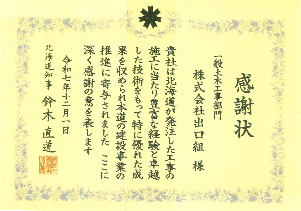 令和7年12月11日に行われた2025年度建設部工事等優秀者表彰の伝達式において、令和6年度に完成した北海道発注工事の施工にあたり北海道知事鈴木直道様より感謝状を拝受しました。