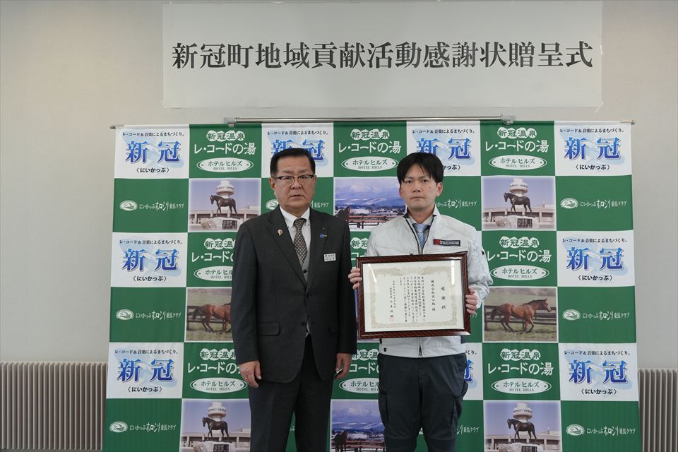 新冠町で行われた感謝状授与式にて、日高自動車道で工事をしている大狩部改良工事が新冠IC開通前記念イベントに協力したことについて新冠町山本正嗣町長から感謝状をいただきました。